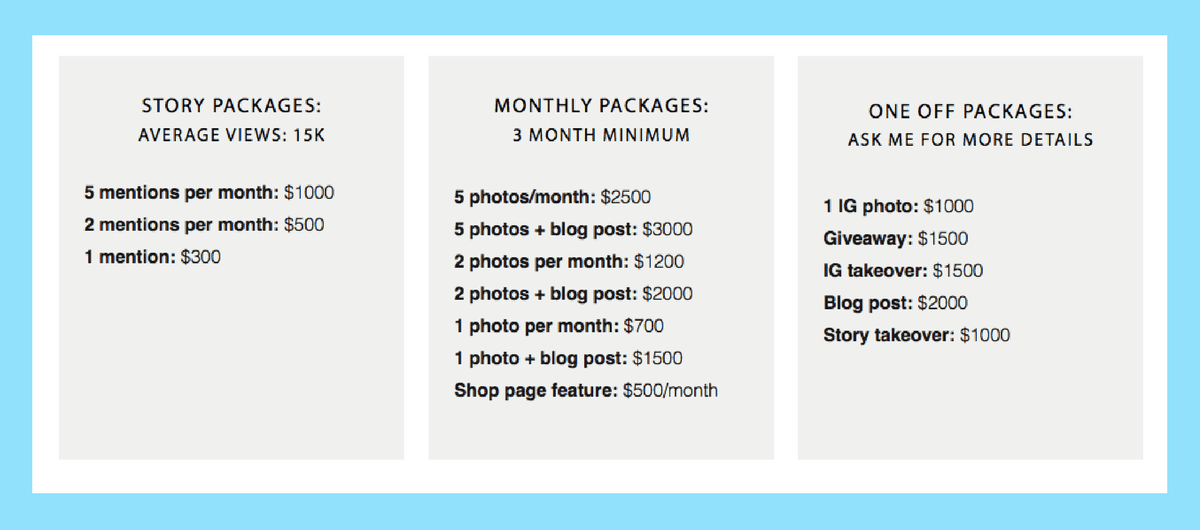 Below is a sample of package options from Later’s post. However, the rates are from a lifestyle blogger, with 118K followers and a 2.5% engagement rate. If you are going hyperlocal/niche, these numbers can be way lower!